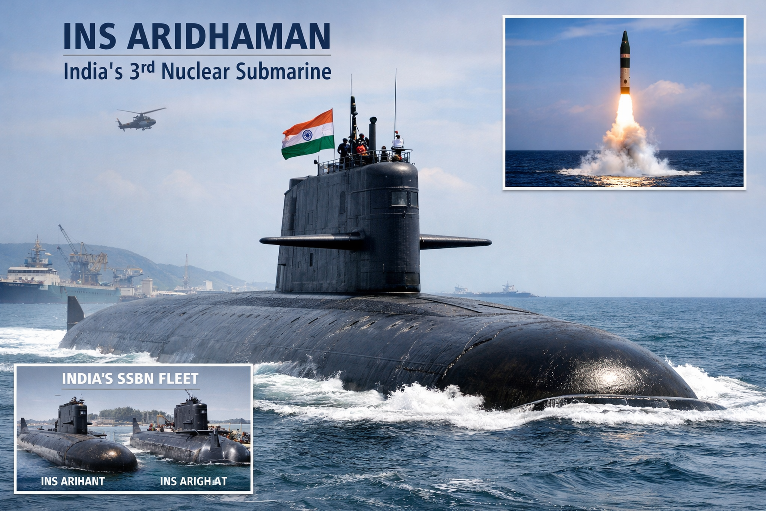 The INS Aridhaman nuclear submarine marks a major advancement in India’s defence capabilities as the country prepares to induct its third indigenously built nuclear-powered ballistic missile submarine. Defence Minister Rajnath Singh recently hinted at its launch during his visit to Visakhapatnam, the hub of India’s nuclear submarine operations. The submarine has successfully completed its final sea trials and is ready for induction into the Strategic Forces Command. Built with improved stealth and strike capabilities, it strengthens India’s maritime security posture. The development reflects India’s focus on self-reliance in defence production. INS Aridhaman follows the successful deployment of INS Arihant and INS Arighaat. Its induction will significantly enhance India’s nuclear deterrence at sea.